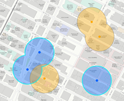 Create buffered areas and dissolve buffers that intersect or have the same field value using the ArcGIS GeoAnalytics Server Create Buffers tool.